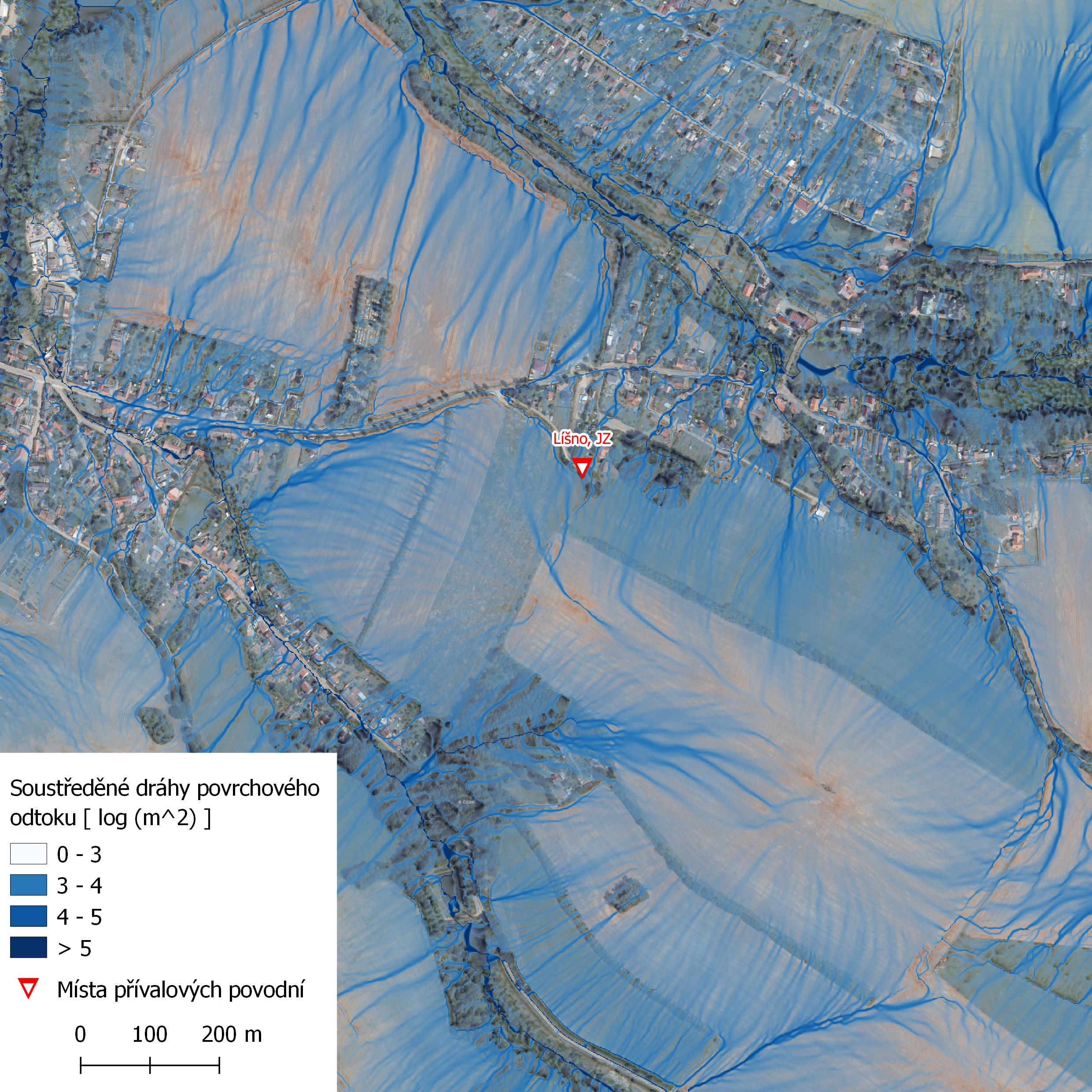 Soustředěné dráhy povrchového odtoku u osady Líšno