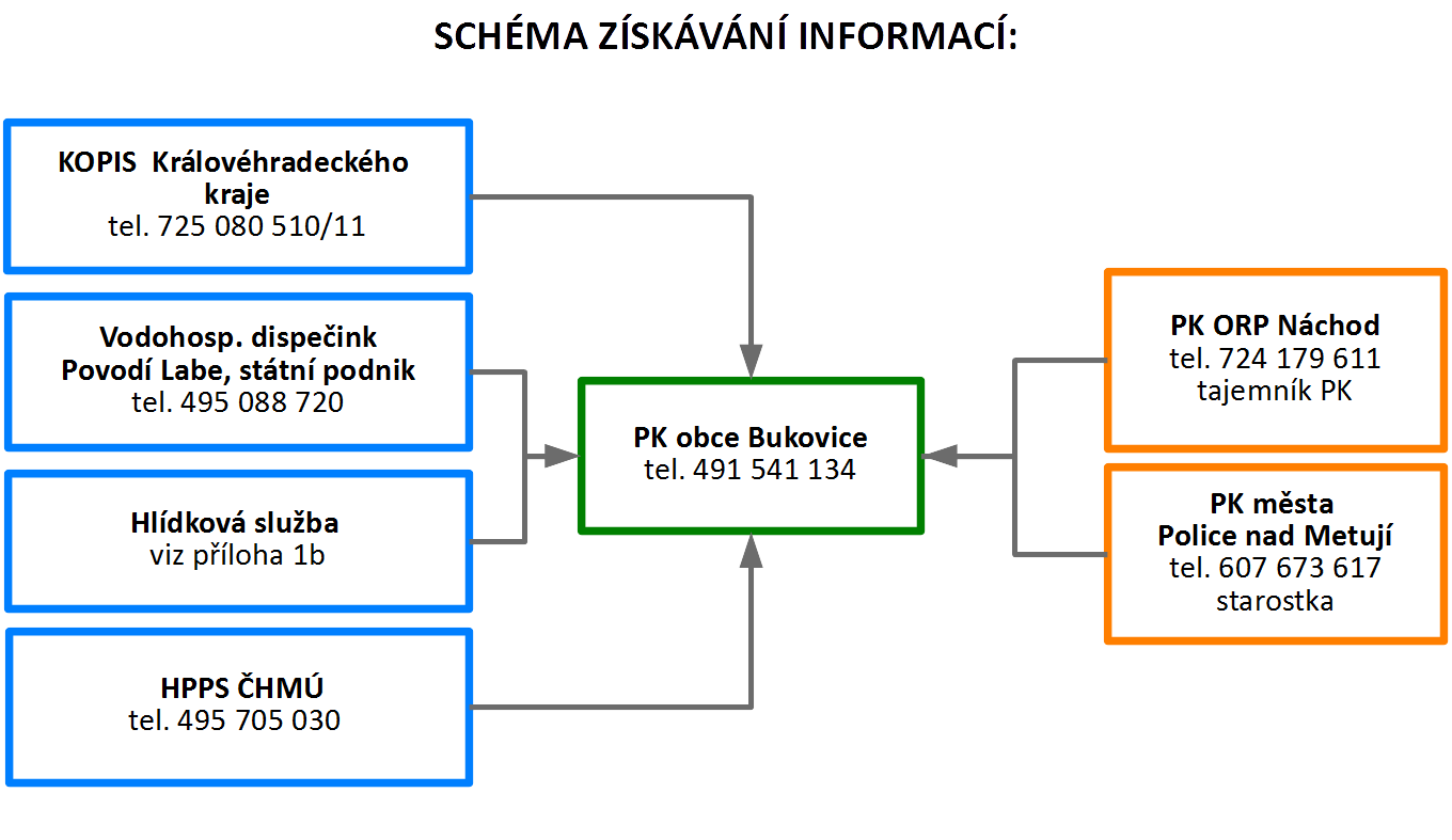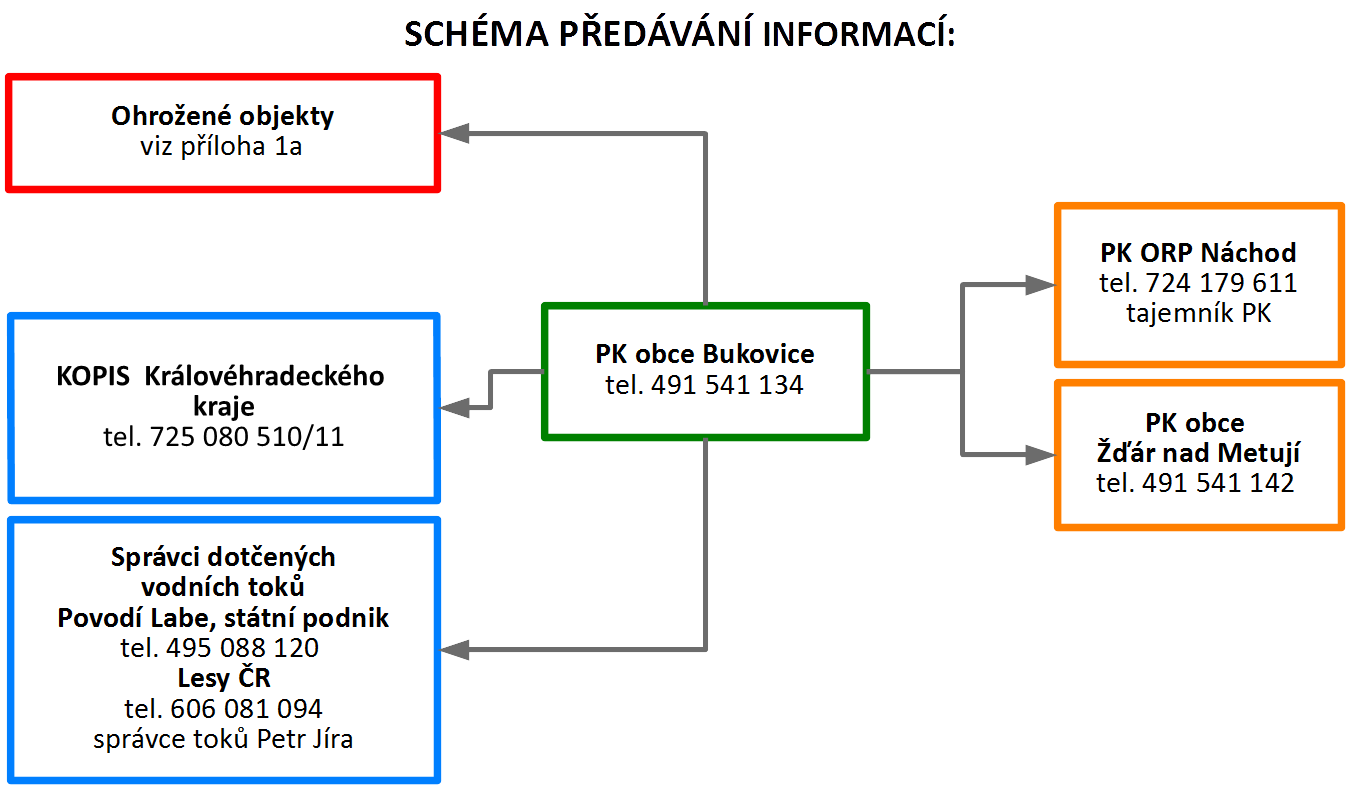 - přílohy povodňového plánu: 1) důležité kontakty, 2) PK obce Bukovice, SO ORP Náchod a PK Královéhradeckého kraje, 3) plán spojení na důležité organizace, 4) dokumenty, 5) seznam ohrožených objektů