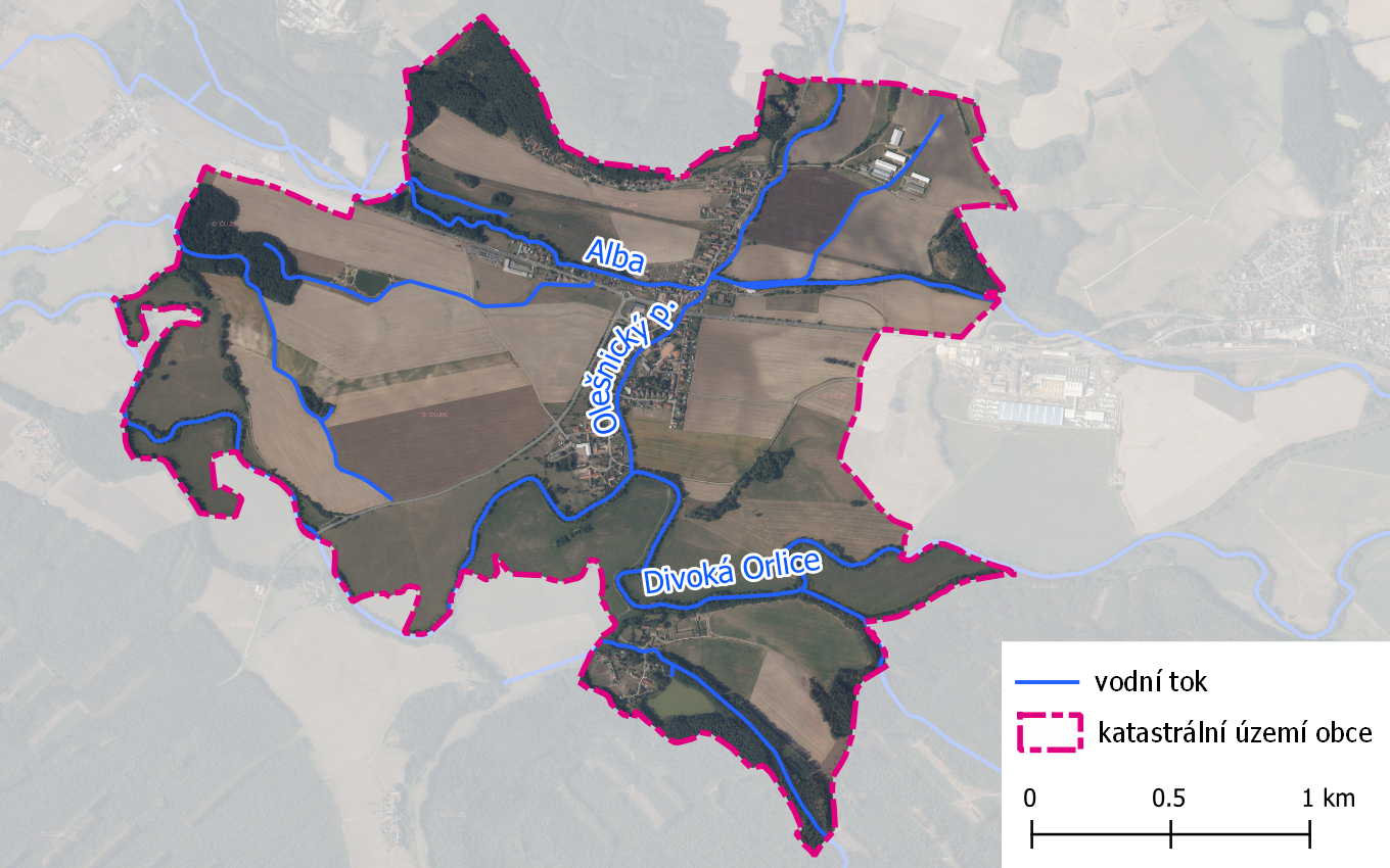 - Olešnický potok - významný vodní tok IDVT 10127284. Pramení na území Uhřínovic. Jeho celková délka je 11,7 km. Protéká několika obcemi a je recipientem oboustranných drobných toků z území. Povodí je přibližně obdélníkového tvaru o rozloze 23,5 km2 se zúžením v intravilánu před ústím do D. Orlice. Průtoky se koncentrují v dolní části toku v Olešnici a Česticích, kde kříží náhon Alba a dál pokračuje do D. Orlice. Průtok Q100 se z výměry povodí odhaduje na 17 m3/s. Při povodňových stavech na Divoké Orlici se v korytě Orlického potoka projevuje zpětné vzdutí, zasahující až do intravilánu
