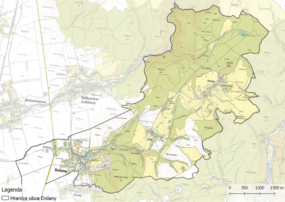Zájmové území se skládá z katastrálního území Dolany (k. ú. 628468), Pohořany (k. ú. 724858) a Véska (k. ú. 780987). Zastavěné území katastru leží na úpatí Nízkého Jeseníku. Terén je členitý se zvyšující se nadmořskou výškou směrem na východ. Zastavěné území má charakter převážně rodinných domů se zahradami a dvory, menších bytových domů a statků doplněné o větší zemědělské a průmyslové komplexy.