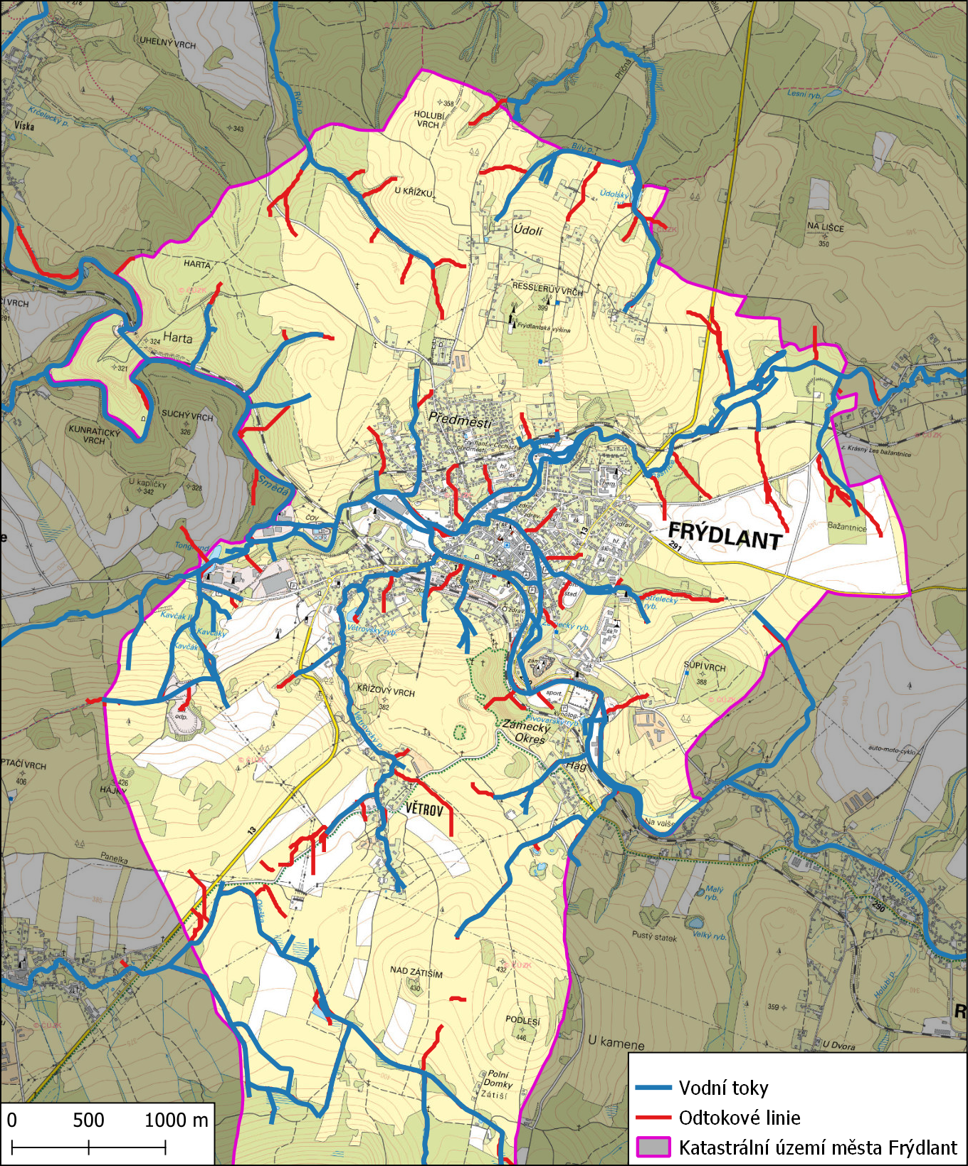 V rámci projektu "Strategie ochrany před negativními dopady povodní a erozními jevy přírodě blízkými opatřeními v České republice" byla vytvořena mapová kompozice odtokové poměry, z níž je čerpáno v následujícím grafickém výstupu. Jedná se o identifikaci odtokových linií (dráhy přímého povrchového odtoku) s přispívající plochou povodí > 5 ha. Tyto odtokové linie mohou dát za vznik soustředěnému povrchovému odtoku, který může způsobit škody na území města Frýdlant. Odtokové linie nezohledňují aktuální využití pozemků ani jiné skutečnosti, které mají vliv na přerušení soustředěného povrchového odtoku.