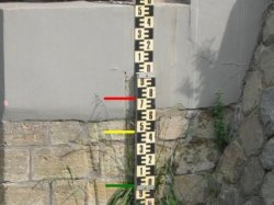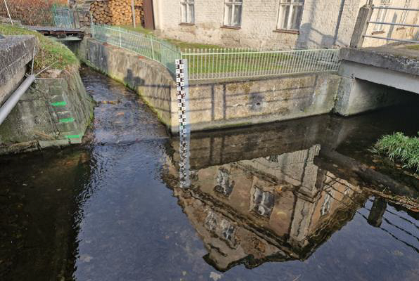 Vodočetná lať ve správě obce (hlásný profil kategorie C) umístěná na propustku u č.p. 16 v obci Petrovice