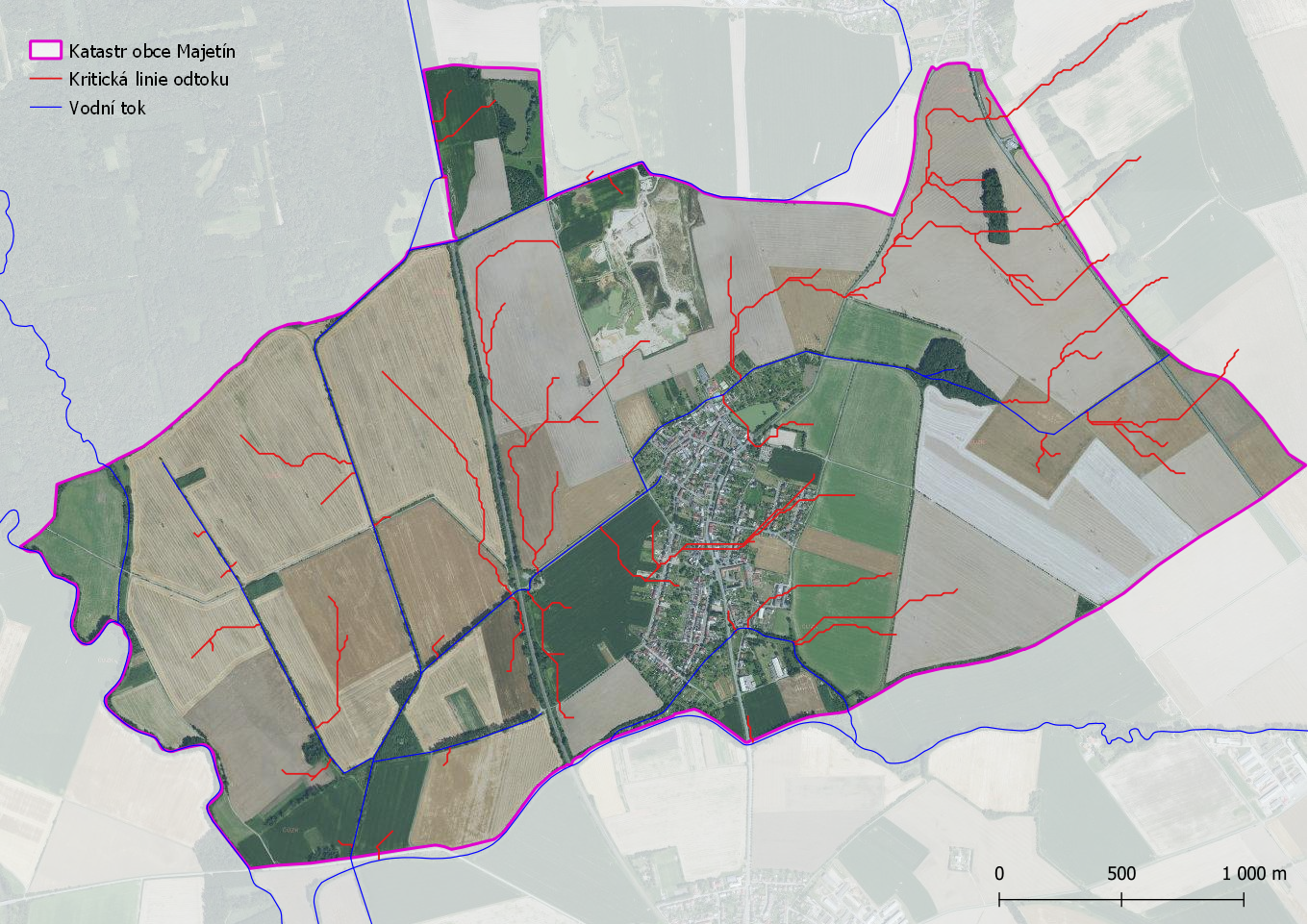 V rámci projektu "Strategie ochrany před negativními dopady povodní a erozními jevy přírodě blízkými opatřeními v České republice" byla vytvořena mapová kompozice odtokové poměry, z níž je čerpáno v následujícím grafickém výstupu. Jedná se o identifikaci odtokových linií (dráhy přímého povrchového odtoku) s přispívající plochou povodí > 5 ha. Tyto odtokové linie mohou dát za vznik soustředěnému povrchovému odtoku, který může způsobit škody na území obce Majetín. Odtokové linie nezohledňují aktuální využití pozemků ani jiné skutečnosti, které mají vliv na přerušení soustředěného povrchového odtoku.