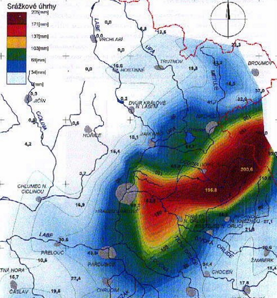 Srážky na území ČR ze dne 22-23. 7. 1998 [mm].