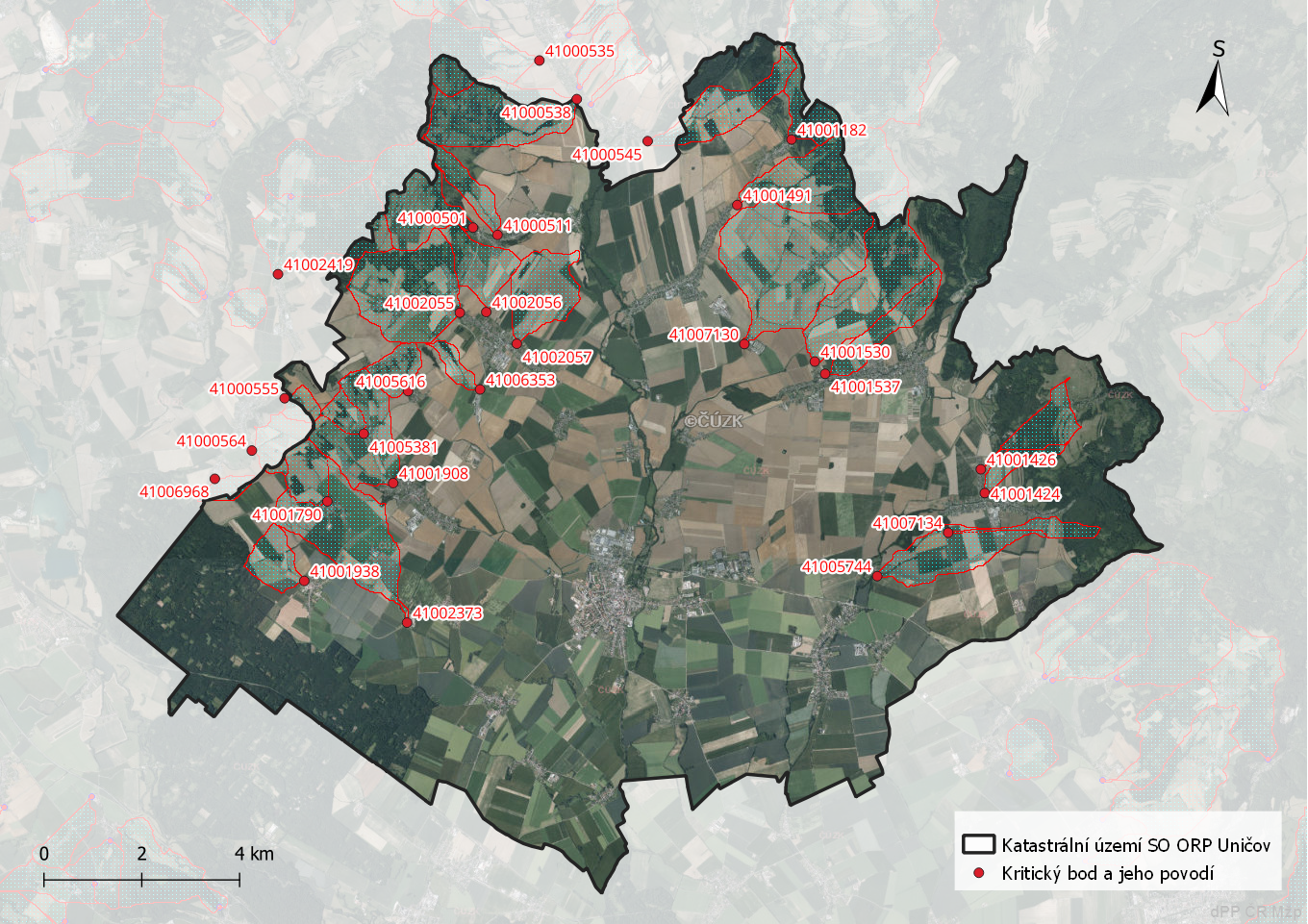 Metodou tzv. kritických bodů byla Výzkumným ústavem vodohospodářským, v. v. i. provedena analýza a vyznačeno území, které může být příčinou lokální přívalové povodně při intenzivních deštích. Kritické body byly stanoveny na základě digitálního modelu terénu s rozlišením buňky 10 x 10 m. K zařazení dráhy soustředěného povrchového odtoku do kritického bodu byly zohledněny tři parametry: velikost přispívající plochy (0,3 - 10,0 km2), průměrný sklon přispívající plochy (>= 3,5 %) a podíl plochy orné půdy v povodí (>= 40 %). V případě, že byl podíl orné půdy menší než 40 %, případně byla plocha zcela zalesněna, byly zohledněny pouze dva parametry a to velikost přispívající plochy (1,0 - 10,0 km2) a průměrný sklon přispívající plochy (>= 5,0 %). Tyto body byly stanoveny pro celé území ČR v měřítku 1: 500 000. »