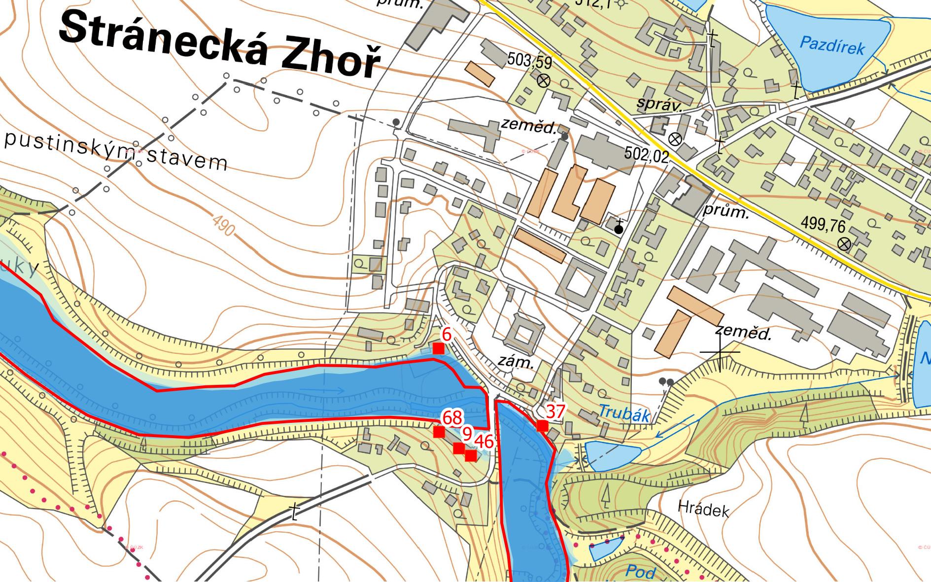 Ohrožené objekty na území místní části Stránecká Zhoř s vyznačeným záplavovým územím