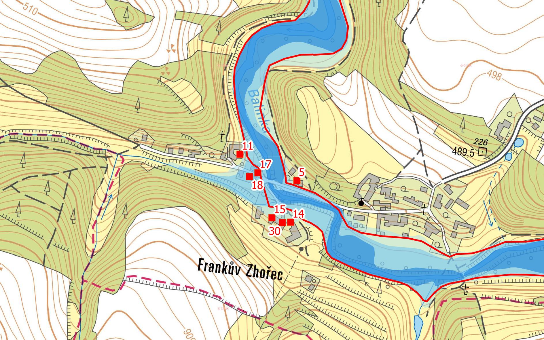 Ohrožené objekty na území místní části Frankův Zhořec s vyznačeným záplavovým územím