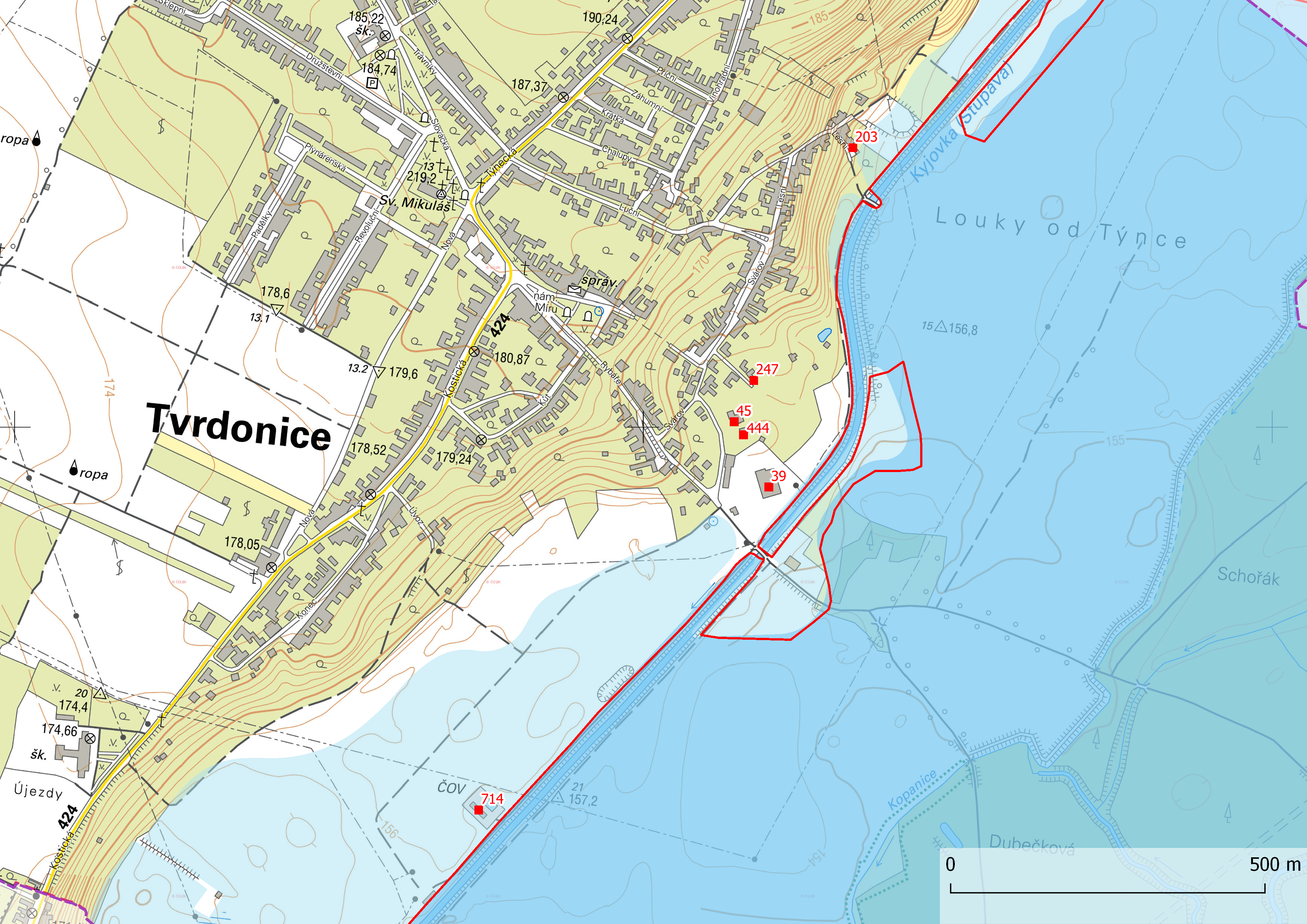 Ohrožené objekty na území obce Tvrdonice s vyznačeným záplavovým územím